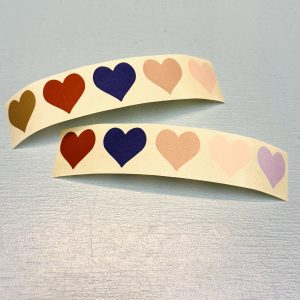 Sticker hartjesvorm 43x50mm , `Vrolijke harten` 5 kleuren ( mix van 10 stuks )