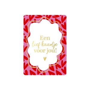 KP klein kaartje A7 , `Een lief kaartje voor jou` roze met rode hartjes