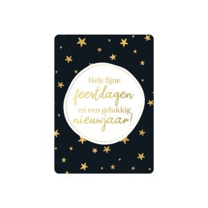 KP klein kaartje A7 , `Hele fijne feestdagen en een gelukkig nieuwjaar` zwart met gouden sterretjes, tekst in witte cirkel
