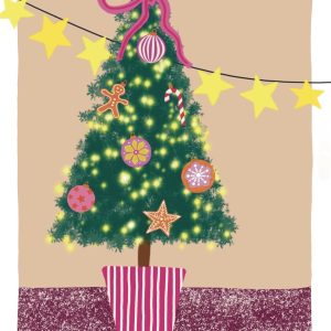 Kaartenpret, A6 kerst kaart van karton `Kerstboom met lichtjes en strik`