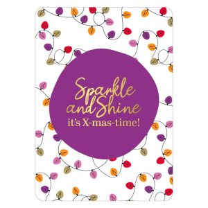 Kerstkaart A6 `Sparkle and shine it`s x-mas time` lichtjes met paarse cirkel