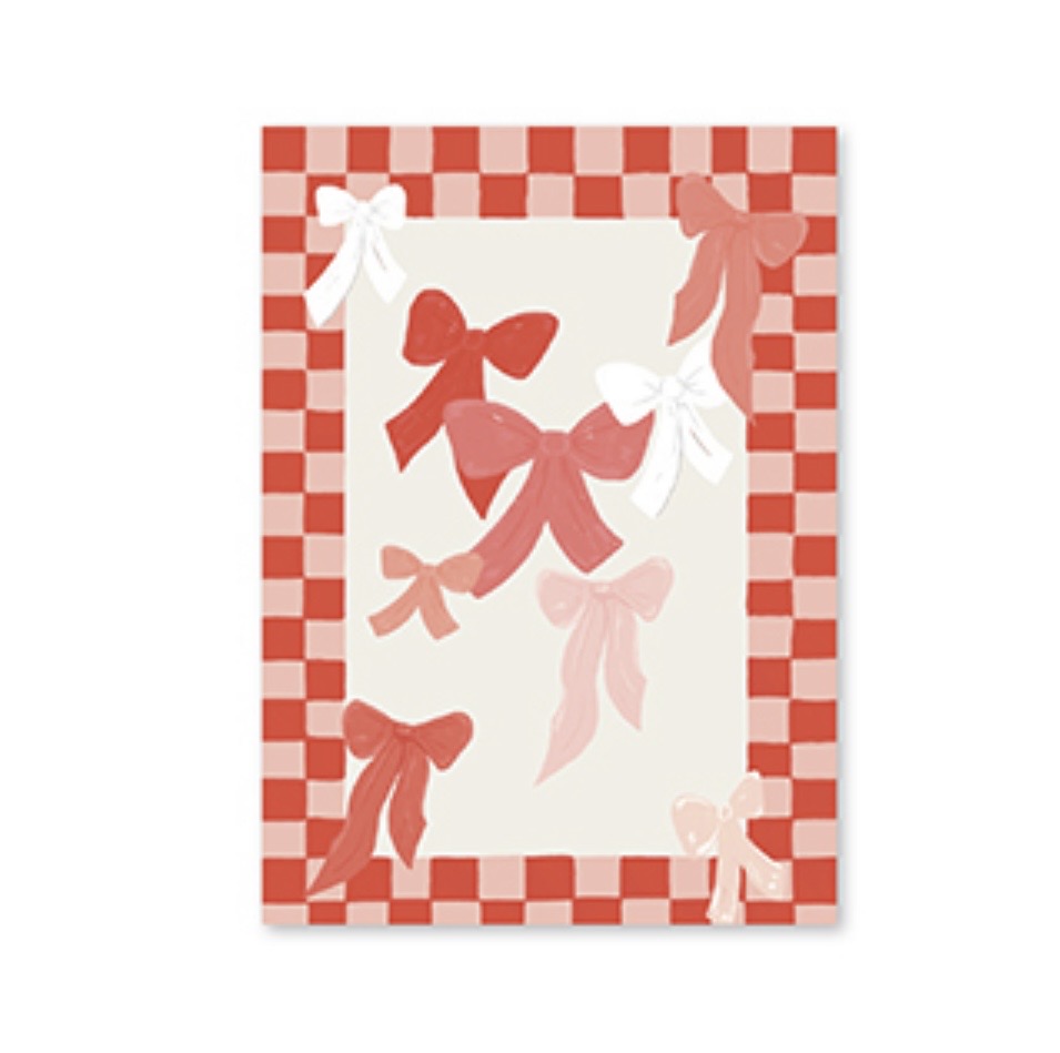 BW klein kaartje A7 ( dunnere kwaliteit ) , `Strikjes rood roze tinten` blokjes rand