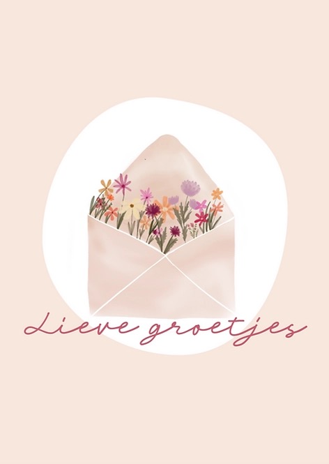 By Streepjes Designs, A6 kaart `Lieve groetjes` envelop met bloemen