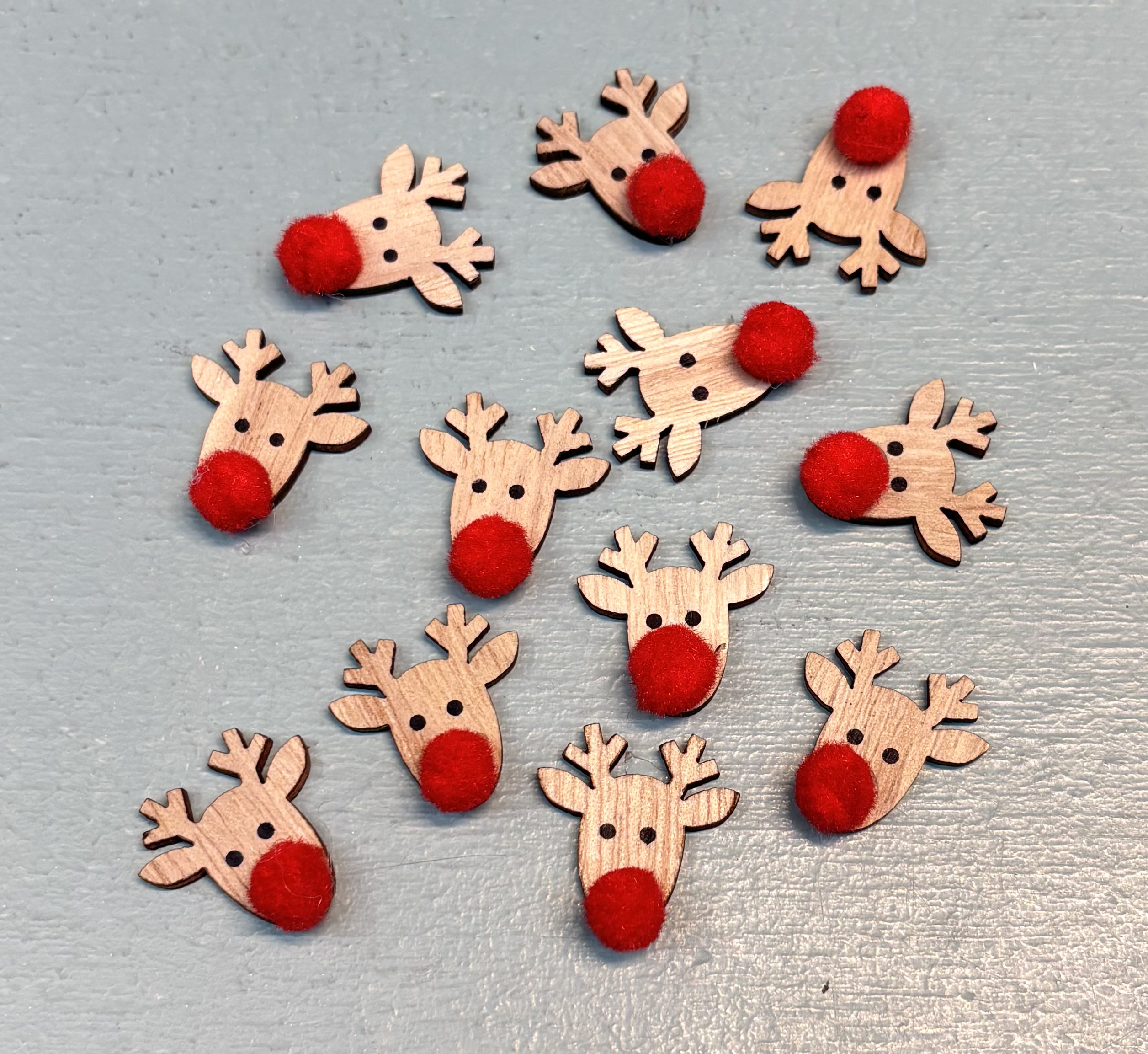 Decoratie houten rendiertjes met rood pompon neusje ( set van 12 stuks )