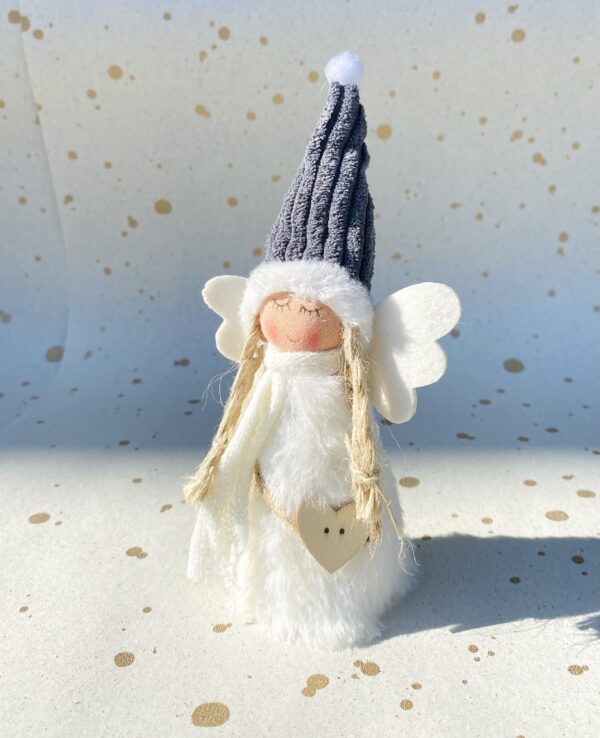 Dit engeltje heeft een off white jurkje , off white sjaaltje , off white vleugeltjes , een grijze puntmuts en een houten hartje.