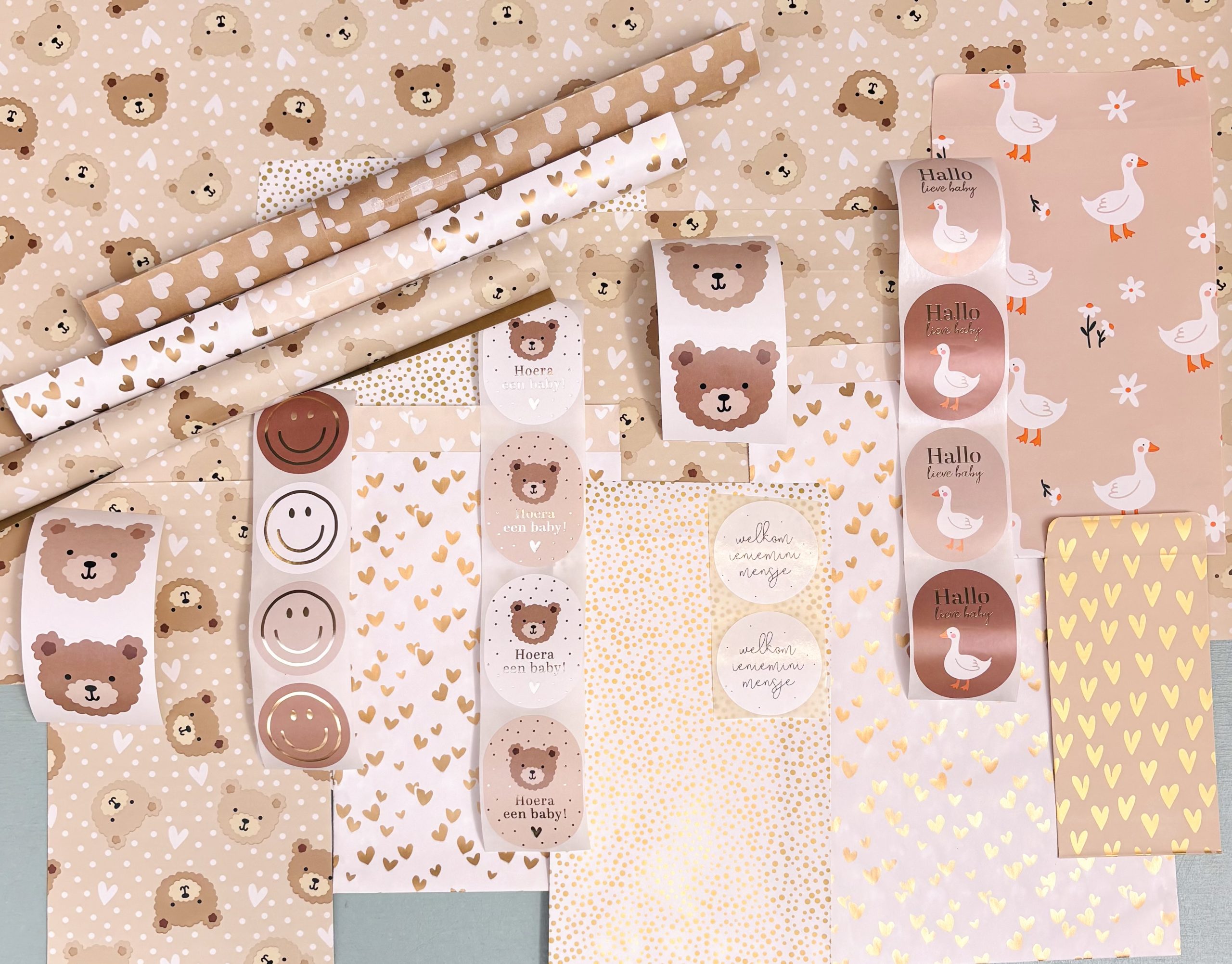 3 rollen inpakpapier ( 30cm x 1 meter ) , 3 large kadozakjes , 4 medium kadozakjes , 1 small kadozakje en 18 bijpassende stickers !