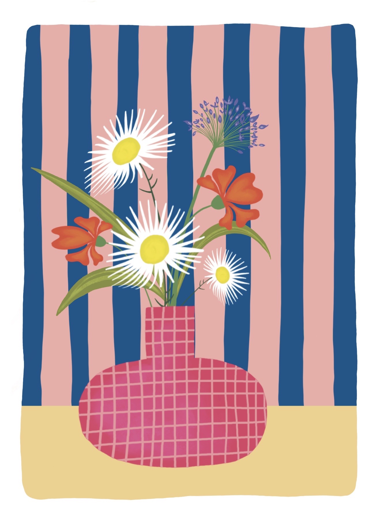 Kaartenpret, A6 kaart van karton `Roze geruite vaas met bloemen`