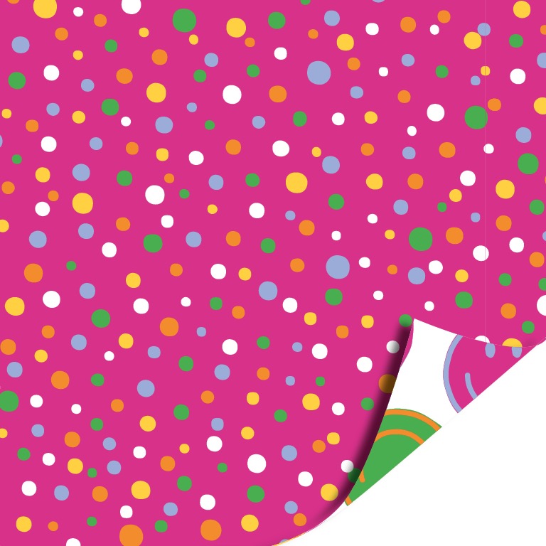 Super vrolijk papier! Confetti multicolor` roze blauw groen geel oranje op roze basis en de achterkant is wit met een smiley print in dezelfde kleuren.