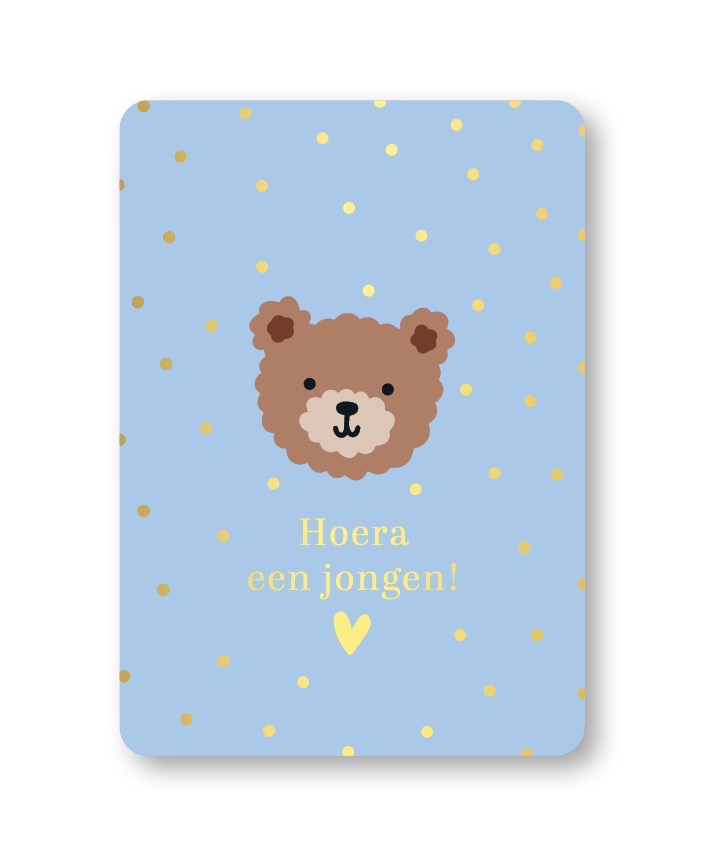 KP kaart A6 `Hoera een jongen! ` beertje op blauwe basis met gouden stipjes