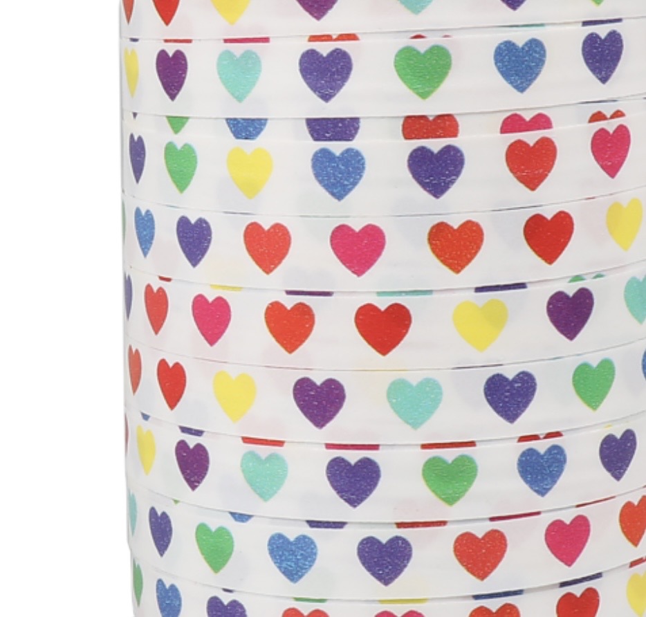 Krullint 10mm paperlook `Gekleurde hartjes op witte basis` ( 5 meter )