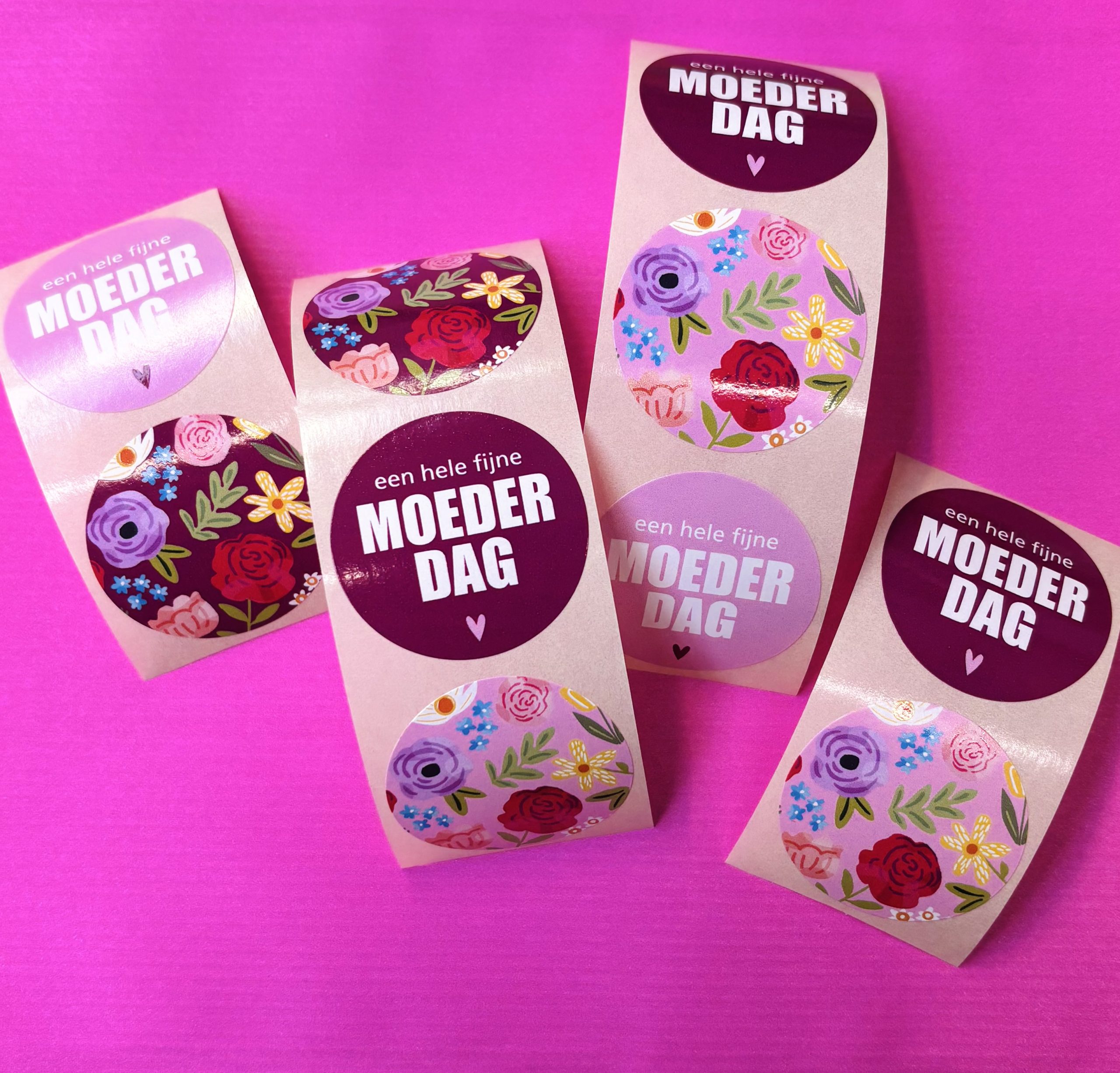 Sticker rond 35mm `Een hele fijne moederdag` paars bordeaux roze bloemen ( mix van 10 stuks )