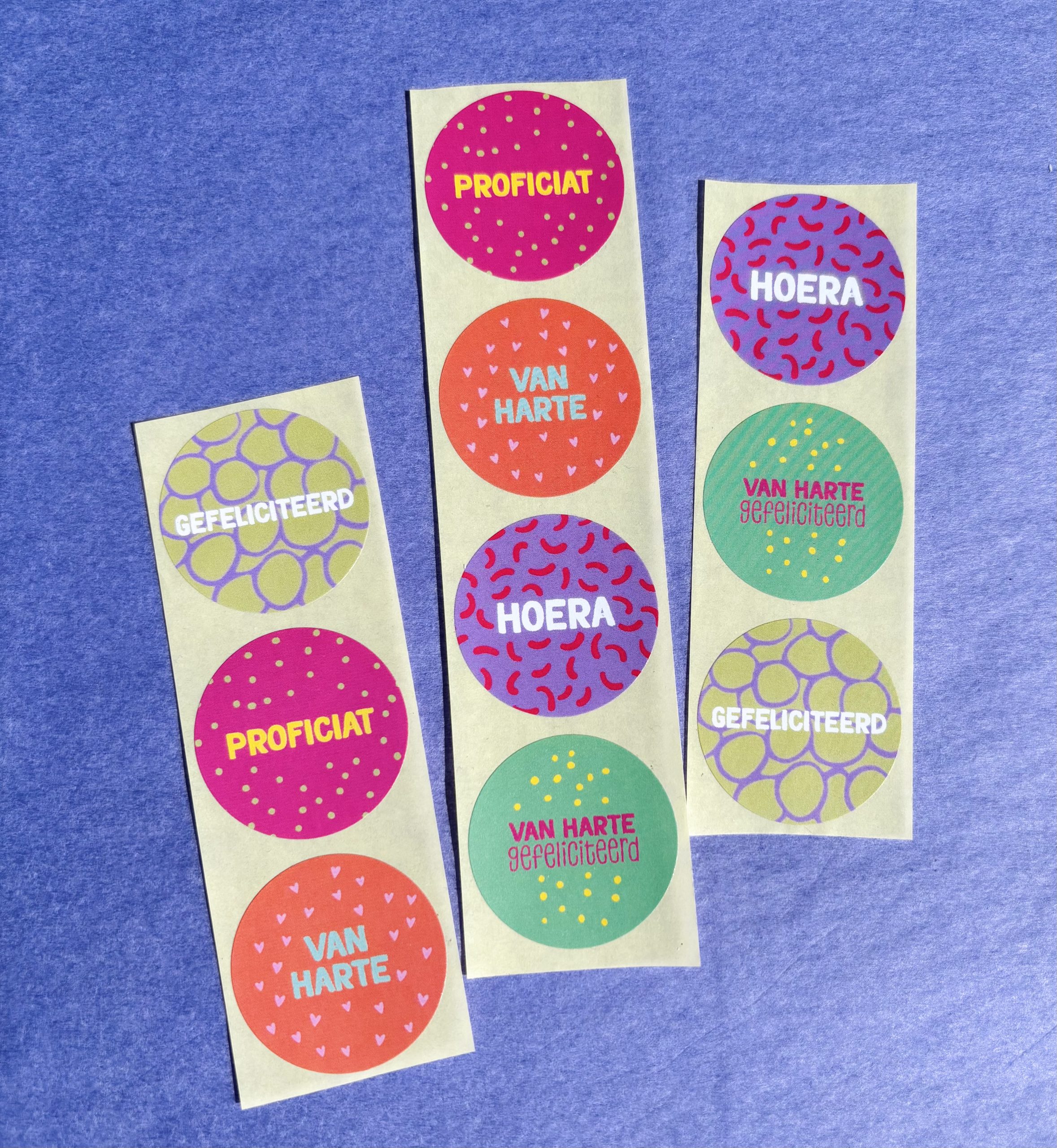Sticker rond 35mm, kleur en print TREND ` Proficiat / van harte / hoera` #1 ( mix van 10 stuks )